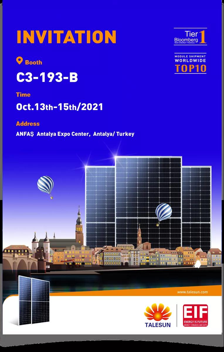 2021年土耳其EIF能源大會暨展覽會將于10月13-15日在土耳其安塔利亞舉行。騰暉光伏將攜系列高效光伏組件亮相這一平臺。歡迎蒞臨我們的展臺C3-193-B。