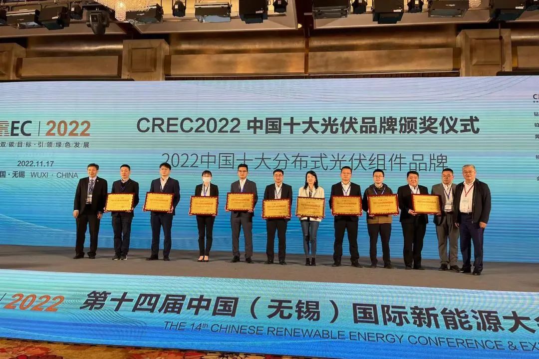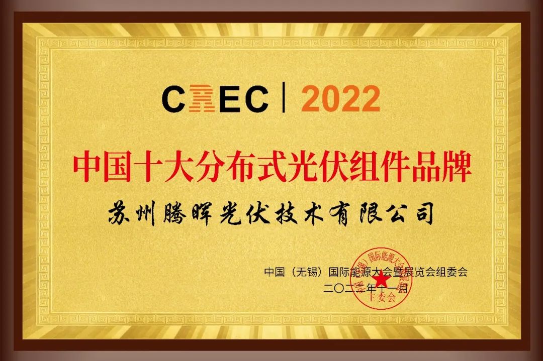 同期,由中國(guó)(無(wú)錫)國(guó)際新能源大會(huì)暨展覽會(huì)(CREC)組委會(huì)舉辦的“中國(guó)十大分布式光伏品牌評(píng)選”活動(dòng)在頒獎(jiǎng)典禮現(xiàn)場(chǎng)正式公布獲獎(jiǎng)企業(yè)榜單,騰暉光伏再次榜上有名,至此,騰暉光伏已數(shù)次榮獲“中國(guó)十大分布式光伏組件品牌”稱號(hào)。