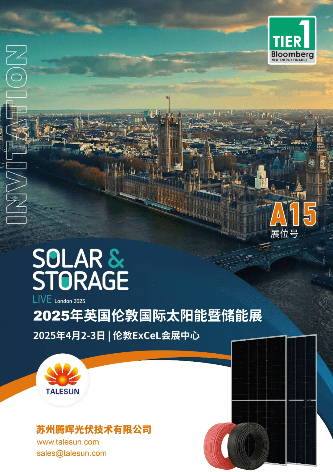 騰暉光伏將于2025年4月2日-4日亮相英國倫敦國際太陽能暨儲能展(Solar & Storage Live London 2025),展位號A15。屆時將展出新一代高效光伏組件,包括TOPCon 600w與HJT 735w等創新產品,展現高功率、低衰減及多場景適配技術優勢。騰暉光伏誠邀全球客戶與行業伙伴蒞臨交流,共探光伏技術前沿趨勢。