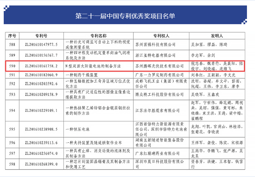 近日,國家知識產權局發布了第二十一屆中國專利獎預獲獎項名單,蘇州騰暉光伏技術有限公司的“N型雙面太陽能電池的制備方法”(ZL201610161758.2)專利榮獲中國專利獎優秀獎。