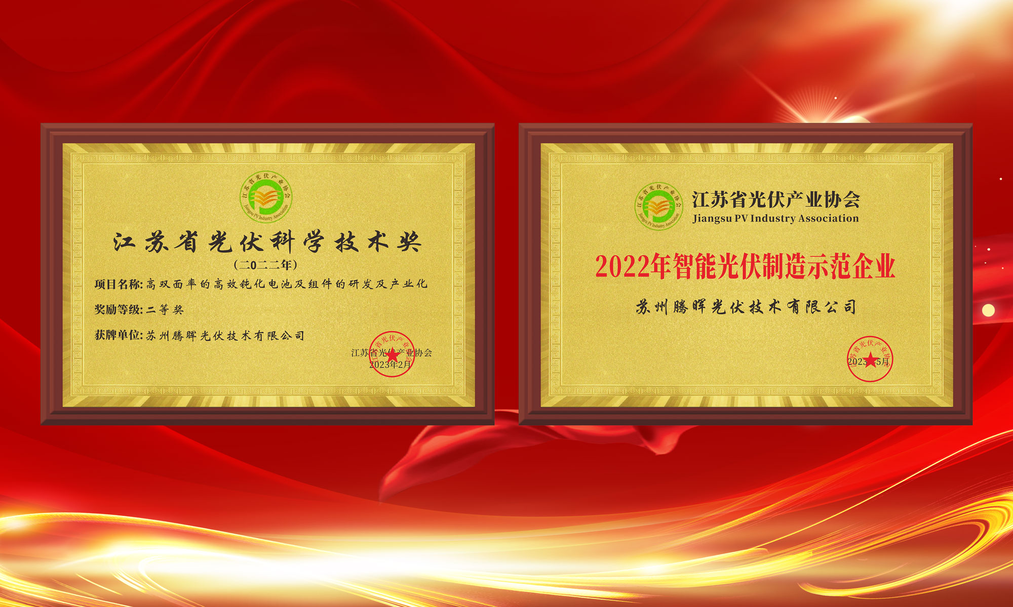 2023年5月9日,騰暉光伏受邀出席江蘇省光伏產(chǎn)業(yè)協(xié)會第四屆會員大會暨光伏行業(yè)智改數(shù)轉(zhuǎn)論壇,并獲“2022年智能光伏制造示范企業(yè)”及“江蘇省光伏科學(xué)技術(shù)獎(jiǎng)”二等獎(jiǎng)兩項(xiàng)殊榮!