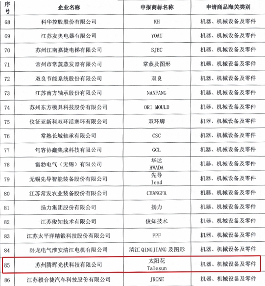 近日,江蘇省商貿局公布2020-2022年度江蘇省重點培育和發展的國際知名品牌名單,我市20家企業獲評,蘇州騰暉光伏技術有限公司成功入選。