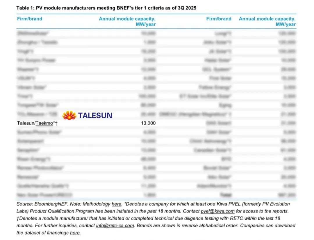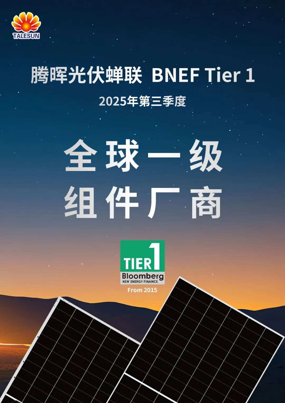 近日,全球知名能源研究機構彭博新能源財經(BloombergNEF)公布了2025年第三季度光伏組件制造商評級榜單。騰暉光伏憑借卓越的產品品質、穩健的財務表現和強大的全球市場競爭力,蟬聯2025年第三季度Tier 1組件制造商榜單。